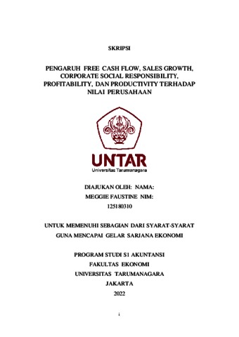 FAUSTINE, MEGGIE (2021) PENGARUH FREE CASH FLOW, SALES GROWTH, CORPORATE SOCIAL RESPONSIBILITY, PROFITABILITY, DAN PRODUCTIVITY TERHADAP NILAI PERUSAHAAN. Skripsi thesis, Universitas Tarumanagara.