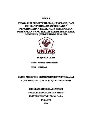 Purnamasari, Melinda (2021) PENGARUH PROFITABILITAS, LEVERAGE, DAN UKURAN PERUSAHAAN TERHADAP PENGHINDARAN PAJAK PADA PERUSAHAAN PERBANKAN YANG TERDAFTAR DI BURSA EFEK INDONESIA (BEI) PERIODE 2016-2020. Skripsi thesis, Universitas Tarumanagara.