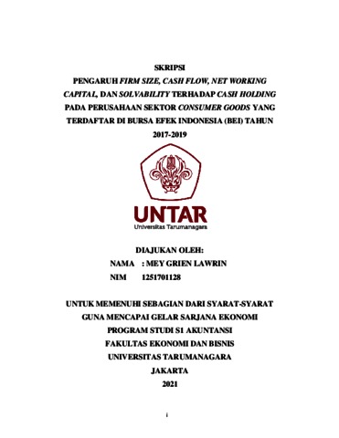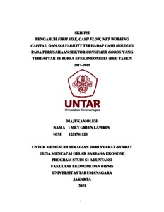 LAWRIN, MEY GRIEN (2021) PENGARUH FIRM SIZE, CASH FLOW, NET WORKING CAPITAL, DAN SOLVABILITY TERHADAP CASH HOLDING PADA PERUSAHAAN SEKTOR CONSUMER GOODS YANG TERDAFTAR DI BURSA EFEK INDONESIA (BEI) TAHUN 2017-2019. Skripsi thesis, Universitas Tarumanagara.