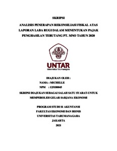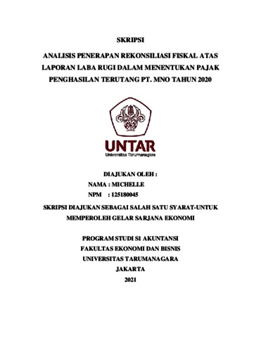 MICHELLE, MICHELLE (2021) ANALISIS PENERAPAN REKONSILIASI FISKAL ATAS LAPORAN LABA RUGI DALAM MENENTUKAN PAJAK PENGHASILAN TERUTANG PT. MNO TAHUN 2020. Skripsi thesis, Universitas Tarumanagara.