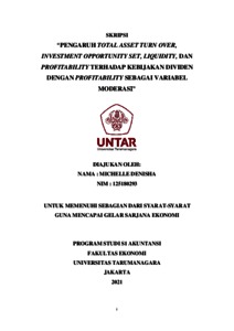 DENISHA, MICHELLE (2021) PENGARUH TOTAL ASSET TURN OVER, INVESTMENT OPPORTUNITY SET,LIQUIDITY DAN PROFITABILITY TERHADAP KEBIJAKAN DIVIDEN DENGAN PROFITABILITY SEBAGAI VARIABEL MODERASI. Skripsi thesis, Universitas Tarumanagara.