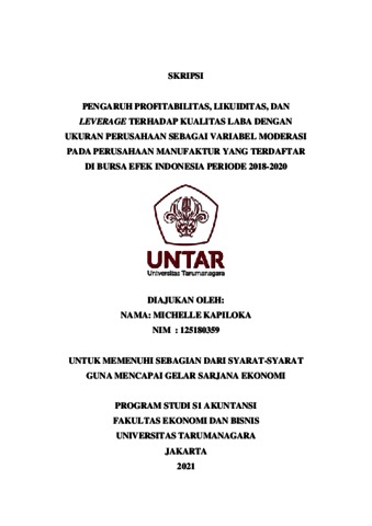 KAPILOKA, MICHELLE (2021) PENGARUH PROFITABILITAS, LIKUIDITAS, DAN LEVERAGE TERHADAP KUALITAS LABA DENGAN UKURAN PERUSAHAAN SEBAGAI VARIABEL MODERASI PADA PERUSAHAAN MANUFAKTUR YANG TERDAFTAR DI BURSA EFEK INDONESIA PERIODE 2018-2020. Skripsi thesis, Universitas Tarumanagara.