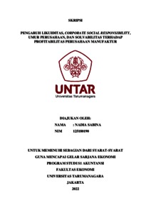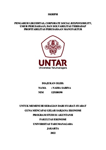 SABINA, NADIA (2021) PENGARUH LIKUIDITAS, CORPORATE SOCIAL RESPONSIBILITY, UMUR PERUSAHAAN, DAN SOLVABILITAS TERHADAP PROFITABILITAS PERUSAHAAN MANUFAKTUR. Skripsi thesis, Universitas Tarumanagara.