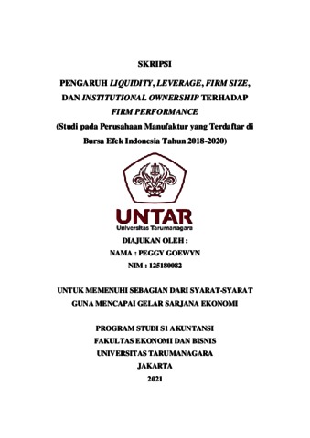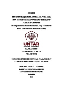 GOEWYN, PEGGY (2021) PENGARUH LIQUIDITY, LEVERAGE, FIRM SIZE, DAN INSTITUTIONAL OWNERSHIP TERHADAP FIRM PERFORMANCE. Skripsi thesis, Universitas Tarumanagara.