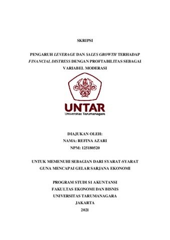 AZARI, REFINA (2021) PENGARUH LEVERAGE DAN SALES GROWTH TERHADAP FINANCIAL DISTRESS DENGAN PROFITABILITAS SEBAGAI VARIABEL MODERASI. Skripsi thesis, Universitas Tarumanagara.