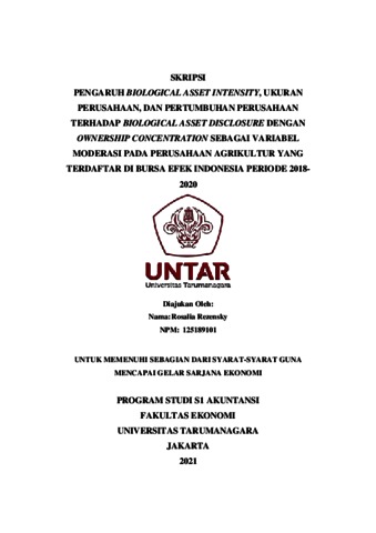 Rezensky, Rosalia (2021) PENGARUH BIOLOGICAL ASSET INTENSITY, UKURAN PERUSAHAAN, DAN PERTUMBUHAN PERUSAHAAN TERHADAP BIOLOGICAL ASSET DISCLOSURE DENGAN OWNERSHIP CONCENTRATION SEBAGAI VARIABEL MODERASI PADA PERUSAHAAN AGRIKULTUR YANG TERDAFTAR DI BURSA EFEK INDONESIA PERIODE 2018-2020. Skripsi thesis, Universitas Tarumanagara.