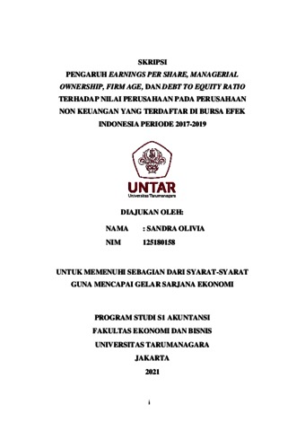 OLIVIA, SANDRA (2021) PENGARUH EARNINGS PER SHARE, MANAGERIAL OWNERSHIP, FIRM AGE DAN DEBT TO EQUITY RATIO TERHADAP NILAI PERUSAHAAN PADA PERUSAHAAN NON KEUANGAN YANG TERDAFTAR DI BURSA EFEK INDONESIA PERIODE 2017-2019. Skripsi thesis, Universitas Tarumanagara.