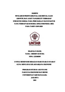 KUSUMA, SHERIN (2021) PENGARUH PROFITABILITAS, LIKUIDITAS, SALES GROWTH, DAN ASSET TANGIBILITY TERHADAP STRUKTUR MODAL PADA PERUSAHAAN MANUFAKTUR YANG TERDAFTAR DI BEI PADA TAHUN 2019-2020. Skripsi thesis, Universitas Tarumanagara.