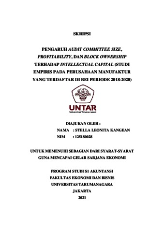 KANGEAN, STELLA LEONITA (2021) PENGARUH AUDIT COMMITTEE SIZE, PROFITABILITY, DAN BLOCK OWNERSHIP TERHADAP INTELLECTUAL CAPITAL (STUDI EMPIRIS PADA PERUSAHAAN MANUFAKTUR YANG TERDAFTAR DI BURSA EFEK INDONESIA PERIODE 2018-2020). Skripsi thesis, Universitas Tarumanagara.