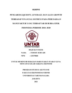 SURYADI, TOMMY (2021) PENGARUH LIQUIDITY, LEVERAGE, DAN SALES GROWTH TERHADAP FINANCIAL DISTRESS PADA PERUSAHAAN MANUFAKTUR YANG TERDAFTAR DI BURSA EFEK INDONESIA PERIODE 2018-2020. Skripsi thesis, Universitas Tarumanagara.