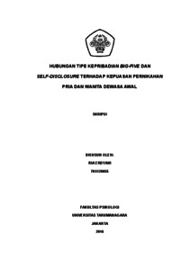 | Uncontrolled Keywords: | Tipe kepribadian big-five, self-disclosure, kepuasan pernikahan, dewasa awal |