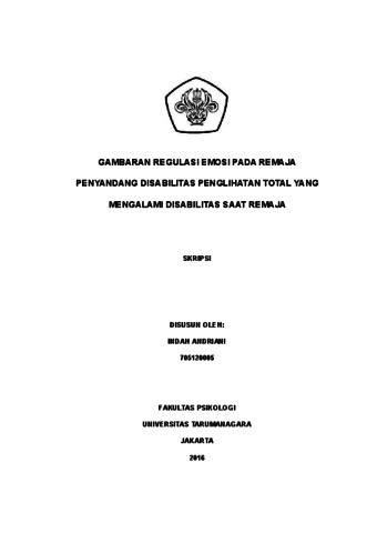 Andriani, Indah (2022) Gambaran Regulasi Emosi pada Remaja Penyandang Disabilitas Penglihatan Total yang Mengalami Disabilitas pada Usia Remaja. Skripsi thesis, Universitas Tarumanagara.