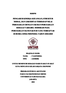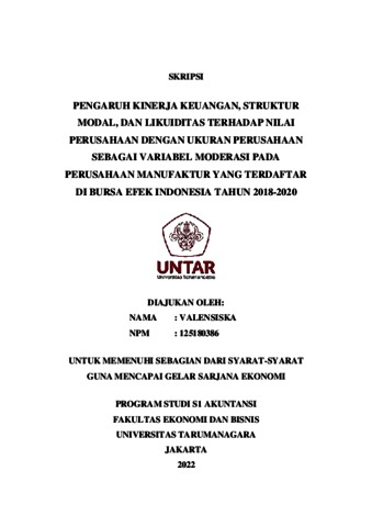 VALENSISKA, VALENSISKA (2021) PENGARUH KINERJA KEUANGAN, STRUKTUR MODAL, DAN LIKUIDITAS TERHADAP NILAI PERUSAHAAN DENGAN UKURAN PERUSAHAAN SEBAGAI VARIABEL MODERASI PADA PERUSAHAAN MANUFAKTUR YANG TERDAFTAR DI BURSA EFEK INDONESIA TAHUN 2018-2020. Skripsi thesis, Universitas Tarumanagara.