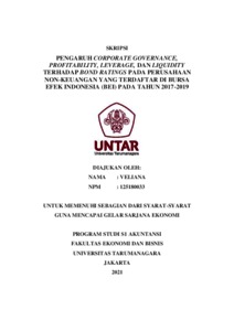 VELIANA, VELIANA (2021) PENGARUH CORPORATE GOVERNANCE, PROFITABILITY, LEVERAGE, DAN LIQUIDITY TERHADAP BOND RATINGS PADA PERUSAHAAN NON-KEUANGAN YANG TERDAFTAR DI BURSA EFEK INDONESIA (BEI) TAHUN 2017-2019. Skripsi thesis, Universitas Tarumanagara.