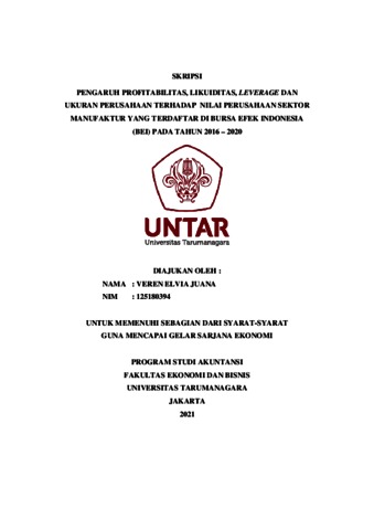JUANA, VEREN ELVIA (2021) PENGARUH PROFITABILITAS, LIKUIDITAS, LEVERAGE DAN UKURAN PERUSAHAAN TERHADAP NILAI PERUSAHAAN SEKTOR MANUFAKTUR YANG TERDAFTAR DI BURSA EFEK INDONESIA (BEI) PADA TAHUN 2016-2020. Skripsi thesis, Universitas Tarumanagara.