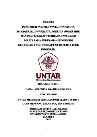 LIONAWAN, VERONICA AGATHA (2021) PENGARUH INSTITUTIONAL OWNERSHIP, MANAGERIAL OWNERSHIP, FOREIGN OWNERSHIP, DAN PROFITABILITY TERHADAP DIVIDEND POLICY PADA PERUSAHAAN INDUSTRI KEUANGAN YANG TERDAFTAR DI BURSA EFEK INDONESIA. Skripsi thesis, Universitas Tarumanagara.