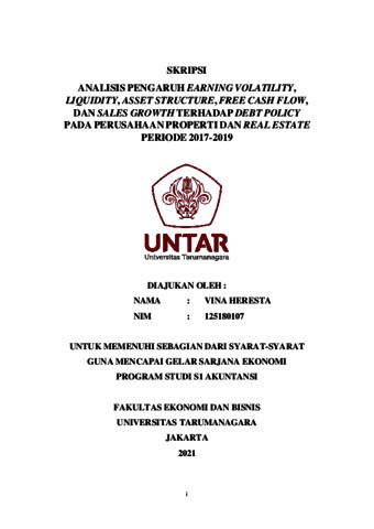 HERESTA, VINA (2021) ANALISIS PENGARUH EARNING VOLATILITY, LIQUIDITY, ASSET STRUCTURE, FREE CASH FLOW, DAN SALES GROWTH TERHADAP DEBT POLICY PADA PERUSAHAAN PROPERTI DAN REAL ESTATE PERIODE 2017-2019. Skripsi thesis, Universitas Tarumanagara.