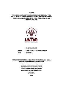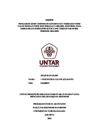 JULIANTO, VINCENTIUS CALVIN (2021) PENGARUH GOOD CORPORATE GOVERNANCE TERHADAP FIRM VALUE DENGAN FIRM SIZE SEBAGAI VARIABEL KONTROL PADA PERUSAHAAN INFRASTRUKTUR YANG TERDAFTAR DI BEI PERIODE 2016-2020. Skripsi thesis, Universitas Tarumanagara.