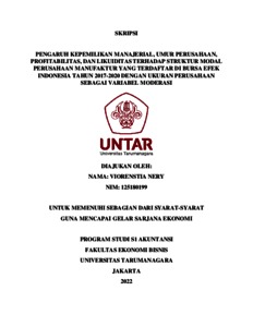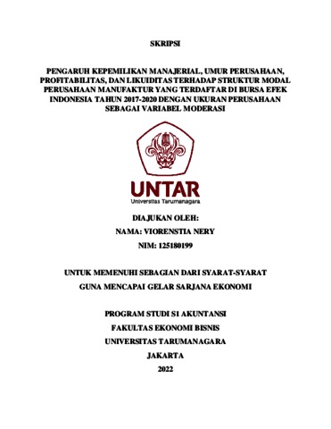 NERY, VIORENSTIA (2021) PENGARUH KEPEMILIKAN MANAJERIAL, UMUR PERUSAHAAN, PROFITABILITAS, DAN LIKUIDITAS TERHADAP STRUKTUR MODAL PERUSAHAAN MANUFAKTUR YANG TERDAFTAR DI BURSA EFEK INDONESIA TAHUN 2017-2020 DENGAN UKURAN PERUSAHAAN SEBAGAI VARIABEL MODERASI. Skripsi thesis, Universitas Tarumanagara.