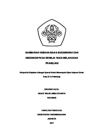 Zefanya, Grace Wilhelmina (2022) Gambaran Kebahagiaan Eudaimonia dan Hedonism pada Remaja yang Melakukan Traveling. Skripsi thesis, Universitas Tarumanagara.