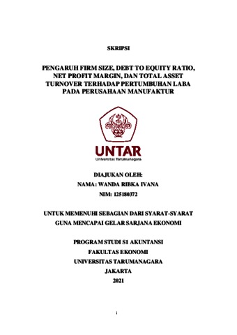 IVANA, WANDA RIBKA (2021) PENGARUH FIRM SIZE, DEBT TO EQUITY RATIO, NET PROFIT MARGIN, DAN TOTAL ASSET TURNOVER TERHADAP PERTUMBUHAN LABA PADA PERUSAHAAN MANUFAKTUR. Skripsi thesis, Universitas Tarumanagara.