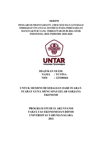 YUVINA, YUVINA (2021) PENGARUH PROFITABILITY, FIRM SIZE DAN LEVERAGE TERHADAP FINANCIAL DISTRESS PADA PERUSAHAAN MANUFAKTUR YANG TERDAFTAR DI BURSA EFEK INDONESIA (BEI) PERIODE 2018-2020. Skripsi thesis, Universitas Tarumanagara.