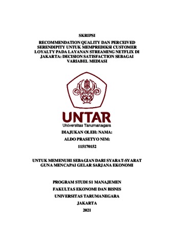 PRASETYO, ALDO (2021) RECOMMENDATION QUALITY DAN PERCEIVED SERENDIPITY UNTUK MEMPREDIKSI CUSTOMER LOYALTY PADA LAYANAN STREAMING NETFLIX DI JAKARTA: DECISION SATISFACTION SEBAGAI VARIABEL MEDIASI. Skripsi thesis, Universitas Tarumanagara.