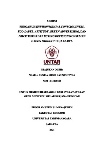 AYUNINGTYAS, ANNISA SHOFI (2021) PENGARUH ENVIRONMENTAL CONSCIOUSNESS, ECO-LABEL, ATTITUDE, GREEN ADVERTISING, DAN PRICE TERHADAP BUYING DECISION KONSUMEN GREEN PRODUCT DI JAKARTA. Skripsi thesis, Universitas Tarumanagara.