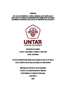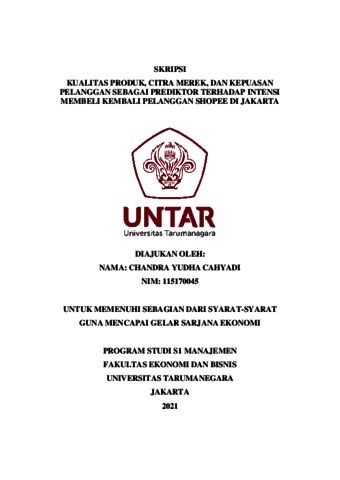 CAHYADI, CHANDRA YUDHA (2021) KUALITAS PRODUK, CITRA MEREK, DAN KEPUASAN PELANGGAN SEBAGAI PREDIKTOR TERHADAP INTENSI MEMBELI KEMBALI PELANGGAN SHOPEE DI JAKARTA. Skripsi thesis, Universitas Tarumanagara.