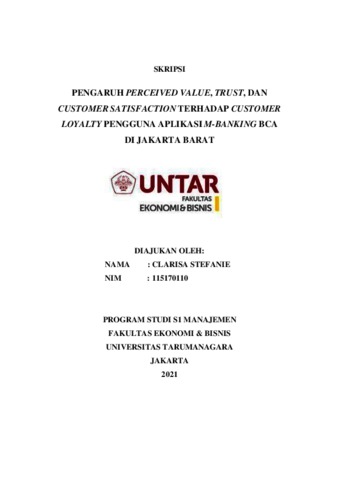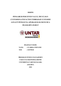 STEFANIE, CLARISA (2021) PENGARUH PERCEIVED VALUE, TRUST, DAN CUSTOMER SATISFACTION TERHADAP CUSTOMER LOYALTY PENGGUNA APLIKASI M-BANKING BCA DI JAKARTA BARAT. Skripsi thesis, Universitas Tarumanagara.