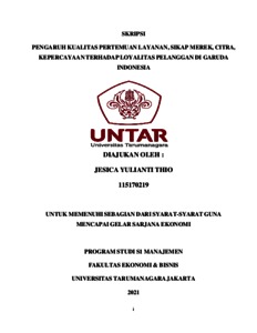 THIO, JESICA YULIANTI (2021) PENGARUH KUALITAS PERTEMUAN LAYANAN, SIKAP MEREK, CITRA, KEPERCAYAAN TERHADAP LOYALITAS PELANGGAN DI GARUDA INDONESIA. Skripsi thesis, Universitas Tarumanagara.