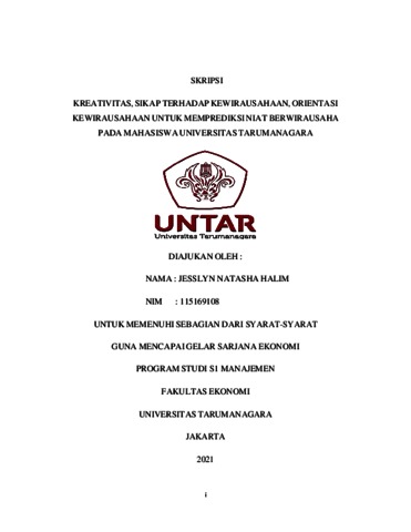 HALIM, JESSLYN NATASHA (2021) KREATIVITAS, SIKAP TERHADAP KEWIRAUSAHAAN, ORIENTASI KEWIRAUSAHAAN UNTUK MEMPREDIKSI NIAT BERWIRAUSAHA PADA MAHASISWA UNIVERSITAS TARUMANAGARA. Skripsi thesis, Universitas Tarumanagara.