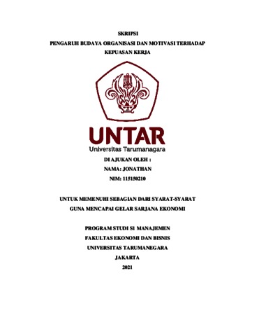 JONATHAN, JONATHAN (2021) PENGARUH BUDAYA ORGANISASI DAN MOTIVASI TERHADAP KEPUASAN KERJA. Skripsi thesis, Universitas Tarumanagara.