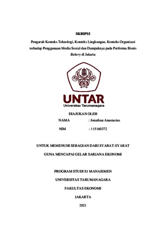 Anastasius, Jonathan (2021) Pengaruh Konteks Teknologi, Konteks Lingkungan, Konteks Organisasi terhadap Penggunaan Media Sosial dan Dampaknya pada Performa Bisnis Bakery di Jakarta. Skripsi thesis, Universitas Tarumanagara.