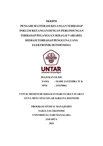 JAYENDRA W K, MADE (2021) PENGARUH LITERASI KEUANGAN TERHADAP INKLUSI KEUANGAN DENGAN PERLINDUNGAN TERHADAP PELANGGAN SEBAGAI VARIABEL MEDIASI TERHADAP PENGGUNA UANG ELEKTRONIK DI INDONESIA. Skripsi thesis, Universitas Tarumanagara.