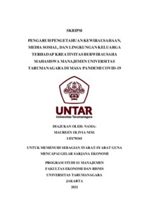 OLIVIA, MAUREEN (2021) PENGARUH PENGETAHUAN KEWIRAUSAHAAN, MEDIA SOSIAL, DAN LINGKUNGAN KELUARGA TERHADAP KREATIVITAS BERWIRAUSAHA MAHASISWA MANAJEMEN UNIVERSITAS TARUMANAGARA DI MASA PANDEMI COVID-19. Skripsi thesis, Universitas Tarumanagara.