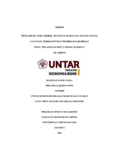 KAKISINA, MIRANDA (2021) PENGARUH CITRA MEREK, KUALITAS MAKANAN, DAN KUALITAS LAYANAN TERHADAP NIAT PEMBELIAN KEMBALI PADA PELANGGAN KFC CABANG KAKIALY DI AMBON. Skripsi thesis, Universitas Tarumanagara.
