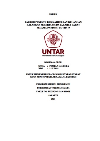 LAVONDA, PAMELA (2021) FAKTOR PENENTU KESEJAHTERAAN KEUANGAN KALANGAN PEKERJA MUDA JAKARTA BARAT SELAMA PANDEMI COVID-19. Skripsi thesis, Universitas Tarumanagara.