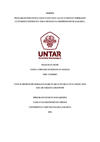 GOZALI, YOHANES KURNIAWAN (2021) PENGARUH PERCEIVED USEFULNESS DAN VALUE FAIRNESS TERHADAP CUSTOMER EXPERIENCE PADA PENGGUNA SHOPEEFOOD DI JAKARTA. Skripsi thesis, Universitas Tarumanagara.