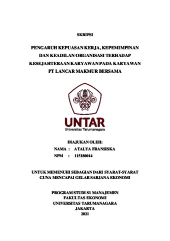 FRANSISKA, ATALYA (2021) PENGARUH KEPUASAN KERJA, KEPEMIMPINAN DAN KEADILAN ORGANISASI TERHADAP KESEJAHTERAAN KARYAWAN PADA KARYAWAN PT LANCAR MAKMUR BERSAMA. Skripsi thesis, Universitas Tarumanagara.