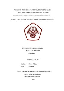 William, Cheow (2020) PENGARUH PENGALAMAN AUDITOR, PREFERENSI KLIEN DAN TIMELINESS TERHADAP KUALITAS AUDIT DENGAN ETIKA AUDITOR SEBAGAI VARIABEL MODERASI. Masters thesis, UNIVERSITAS TARUMANAGARA.