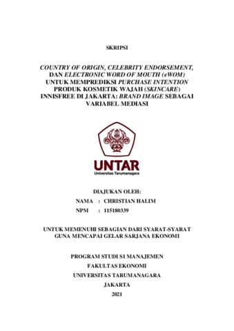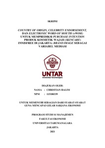 HALIM, CHRISTIAN (2021) COUNTRY OF ORIGIN, CELEBRITY ENDORSEMENT, DAN ELECTRONIC WORD OF MOUTH (eWOM) UNTUK MEMPREDIKSI PURCHASE INTENTION PRODUK KOSMETIK WAJAH (SKINCARE) INNISFREE DI JAKARTA: BRAND IMAGE SEBAGAI VARIABEL MEDIASI. Skripsi thesis, Universitas Tarumanagara.