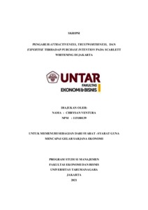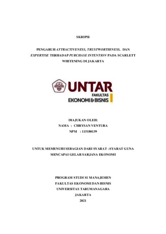 VENTURA, CHRYSAN (2021) PENGARUH ATTRACTIVENESS, TRUSTWORTHINESS, DAN EXPERTISE TERHADAP PURCHASE INTENTION PADA SCARLETT WHITENING DI JAKARTA. Skripsi thesis, Universitas Tarumanagara.