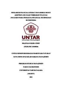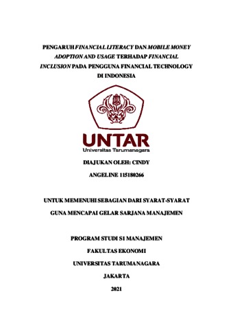 ANGELINE, CINDY (2021) PENGARUH FINANCIAL LITERACY DAN MOBILE MONEY ADOPTION AND USAGE TERHADAP FINANCIAL INCLUSION PADA PENGGUNA FINANCIAL TECHNOLOGY DI INDONESIA. Skripsi thesis, Universitas Tarumanagara.