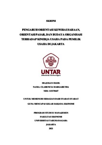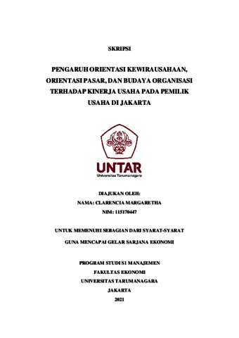 MARGARETHA, CLARENCIA (2021) PENGARUH ORIENTASI KEWIRAUSAHAAN, ORIENTASI PASAR, DAN BUDAYA ORGANISASI TERHADAP KINERJA USAHA PADA PEMILIK USAHA DI JAKARTA. Skripsi thesis, Universitas Tarumanagara.