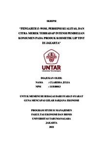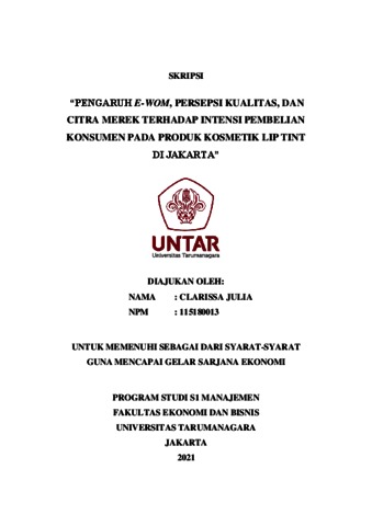 JULIA, CLARISSA (2022) PENGARUH E-WOM, PERSEPSI KUALITAS, DAN CITRA MEREK TERHADAP INTENSI PEMBELIAN KONSUMEN PADA PRODUK KOSMETIK LIP TINT DI JAKARTA. Skripsi thesis, Universitas Tarumanagara.