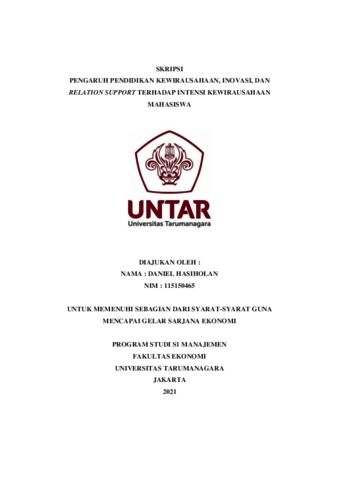 HASIHOLAN, DANIEL (2022) PENGARUH PENDIDIKAN KEWIRAUSAHAAN, INOVASI, DAN RELATION SUPPORT TERHADAP INTENSI KEWIRAUSAHAAN MAHASISWA. Skripsi thesis, Universitas Tarumanagara.