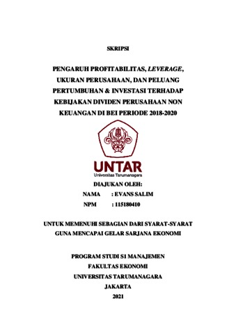 SALIM, EVANS (2022) PENGARUH PROFITABILITAS, LEVERAGE, UKURAN PERUSAHAAN, DAN PELUANG PERTUMBUHAN & INVESTASI TERHADAP KEBIJAKAN DIVIDEN PERUSAHAAN NON KEUANGAN DI BEI PERIODE 2018-2020. Skripsi thesis, Universitas Tarumanagara.