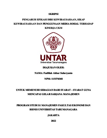 Dalam menjalankan suatu usaha kecil dan menengah (UKM) itu membutuhkan kinerja UKM yang sangat baik untuk menjalankannya, untuk memiliki kinerja UKM yang sangat baik itu membutuhkan efikasi diri kewirausahaan yang baik agar memiliki kepercayaan diri yang tinggi dalam menjalankan usaha itu, sikap kewirausahaan yang bagus agar memiliki sikap yang mentalnya kuat ketika terjadi resiko dan penggunaan media sosial yang baik agar bisa memanfaatkan media sosial sekarang untuk melakukan transaksi dengan konsumen atau memasarkan produk atau jasa yang dijual. Dari penjelaskan diatas dapat dikatakan kalau efikasi diri kewirausahaan, sikap kewirausahaan dan penggunaan media sosial memiliki pengaruh terhadap kinerja UKM. Tujuan dari penelitian ini yaitu untuk mengetahui pengaruh efikasi diri kewirausahaan, sikap kewirausahaan dan penggunaan media sosial terdapad kinerja UKM. Populasi yang digunakan dalam penelitian ini yaitu pemilik UKM kuliner didaerah Kelapa gading. Jumlah sampel yang digunakan untuk penelitian ini yaitu 50 responden dengan menggunakan non-probability sampling untuk pengumpulan data dan menggunakan teknik purposive sampling yang kriterianya yaitu UKM kuliner di daerah kelapa gading. Metode analisis dalam penelitian ini menggunakan Software SmartPLS versi 3.3.3. Hasil dari penelitian ini menyatakan kalau sikap kewirausahaan memiliki pengaruh namun tidak signifikan terhadap kinerja UKM, sedangkan efikasi diri kewirausahaan dan penggunaan media sosial berpengaruh positif dan signifikan terhadap kinerja UKM. Hasil dari penelitian ini diharapkan dapat memberi manfaat kepada para pemilik UKM, manfaat ini berguna untuk menyelesaikan masalah yang berkaitan dengan efikasi diri kewirausahaan, sikap kewirausahaan dan penggunaan media sosial terhadap kinerja UKM. Diharapkan bisa meningkatkan kinerja UKM dalam menjalankan usahanya pada zaman sekarang.