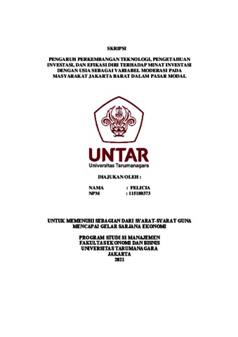 FELICIA, FELICIA (2022) PENGARUH PERKEMBANGAN TEKNOLOGI, PENGETAHUAN INVESTASI, DAN EFIKASI DIRI TERHADAP MINAT INVESTASI DENGAN USIA SEBAGAI VARIABEL MODERASI PADA MASYARAKAT JAKARTA BARAT DALAM PASAR MODAL. Skripsi thesis, Universitas Tarumanagara.